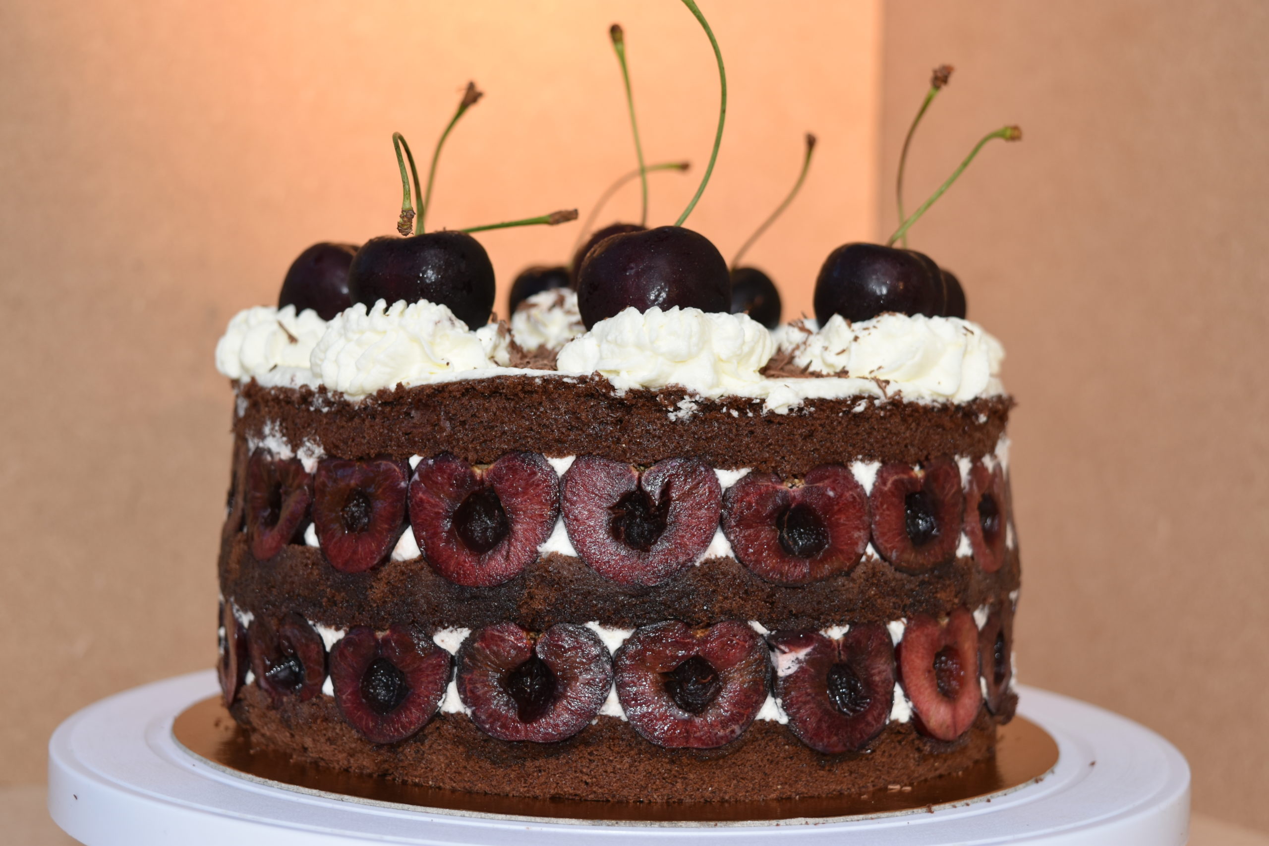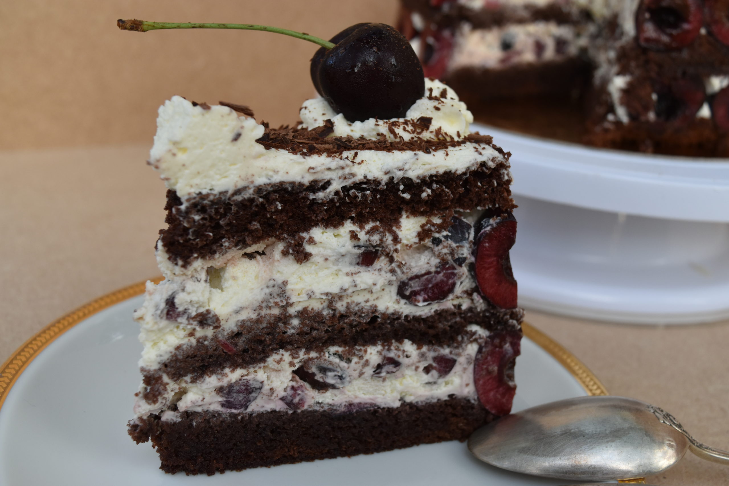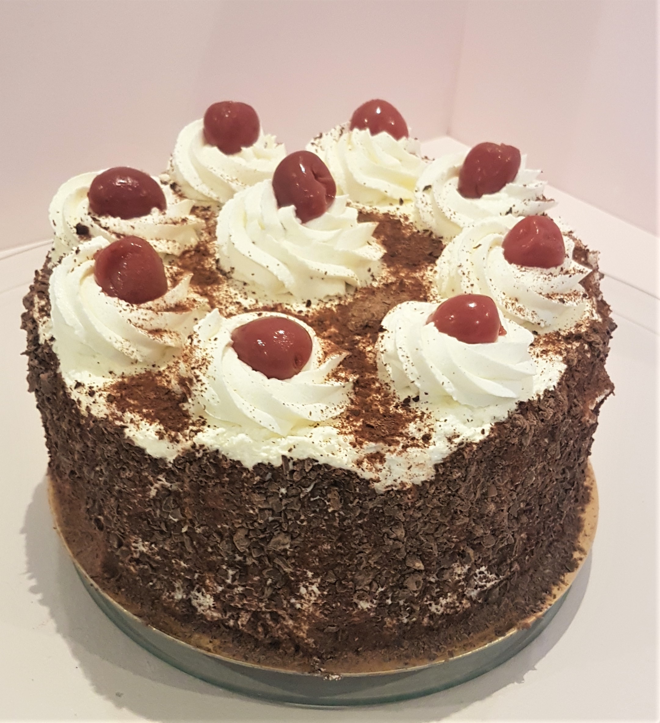 La forêt-noire, est une pâtisserie allemande composée d’une génoise au cacao imbibée de sirop & kirsch, fourrée de crème chantilly et de cerises. Elle est recouverte de crème chantilly et décorée de copeaux de chocolat.