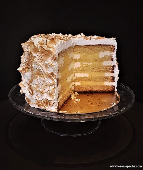 J’ai monté mon gateau sur 5 couches fourré de crème citron, que j’ai ensuite recouvert de meringue italienne.